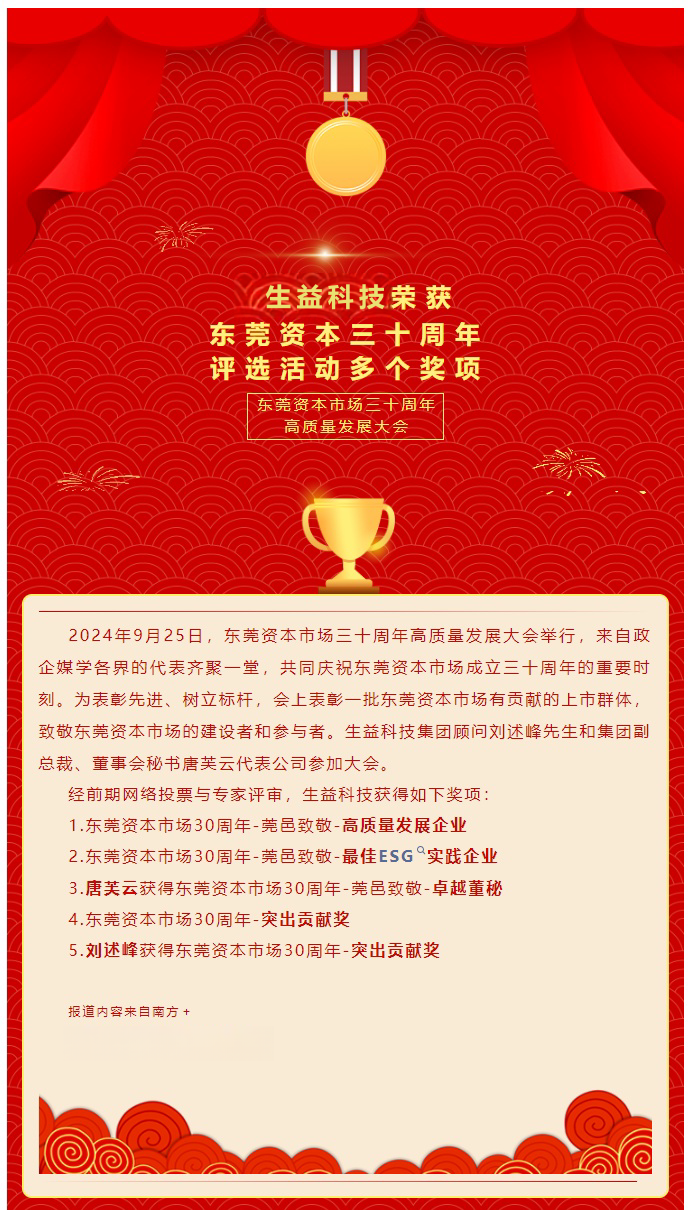 生益科技榮獲東莞資本三十周年評選活動(dòng)多個(gè)獎項