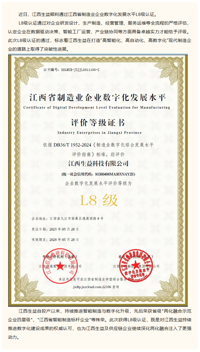江西生益順利通過(guò)江西省制造業(yè)企業(yè)數字化發(fā)展水平L8級認證