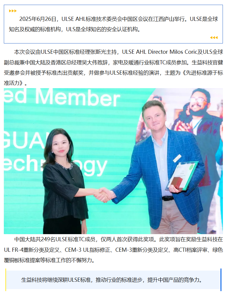 祝賀生益科技官健獲得ULSE標準杰出貢獻獎